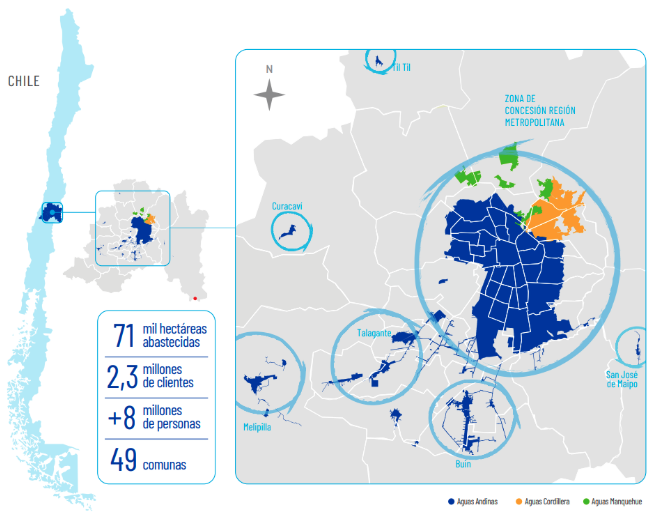 Estos clientes se encuentran distribuidos en sus zonas de concesión, que abarcan un territorio de 71 mil hectáreas ubicado en la Región Metropolitana.